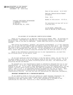 I will scan the document in as a jpeg later. I am away from my printer/scanner for a couple of days The Secretary of States office for Florida will correct one error which is that they omitted our IRS Employer Identification Number: 26-4648146 which will be corrected by the State of Florida within the next 24 to 72 hours. We will be making another announcement shortly. Certificate of Status