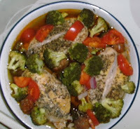 Tonight's dinner is baked chicken breast rubbed with garlic and fresh ground pepper. During the last 10 minutes of cooking we added diced red onion, sliced Roma Tomato's, broccoli crowns, sliced fresh mushrooms and two jalapeno peppers diced, and one sliced Italian sausage for added flavor. Will serve over a bed of brow
