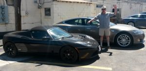 Here’s my spouse pointing out the difference between the Roadster and the Model S beside it. The thing came up to his waist.