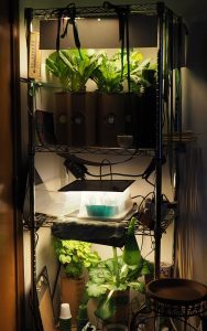 This tower rack sits in the corner of my office (because it’s the coolest room in the house), taking up a 2’x3′ footprint. It’s got lettuces up top, seedlings in the center, and bok choy and basil plants on the bottom. Both of those produce amazing amounts of wonderful leaves. I think they’re both over a year old, now.