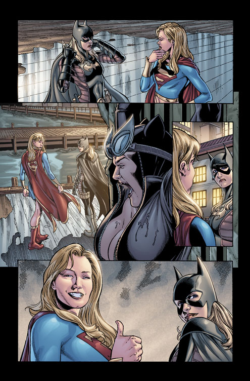 Okay, I got a little bit of crap in some quarters for this scene, mostly because some people considered it to be fan service. Especially the fact that I chose to have Catwoman's suit zipped open. I'll cop to it, because at that point I really didn't have many opportunities to draw sexy women. I did try to minimize it. It's also a well established visual cue. If you go back and read Catwoman, the only time she has the suit completely zipped is when she's in action.