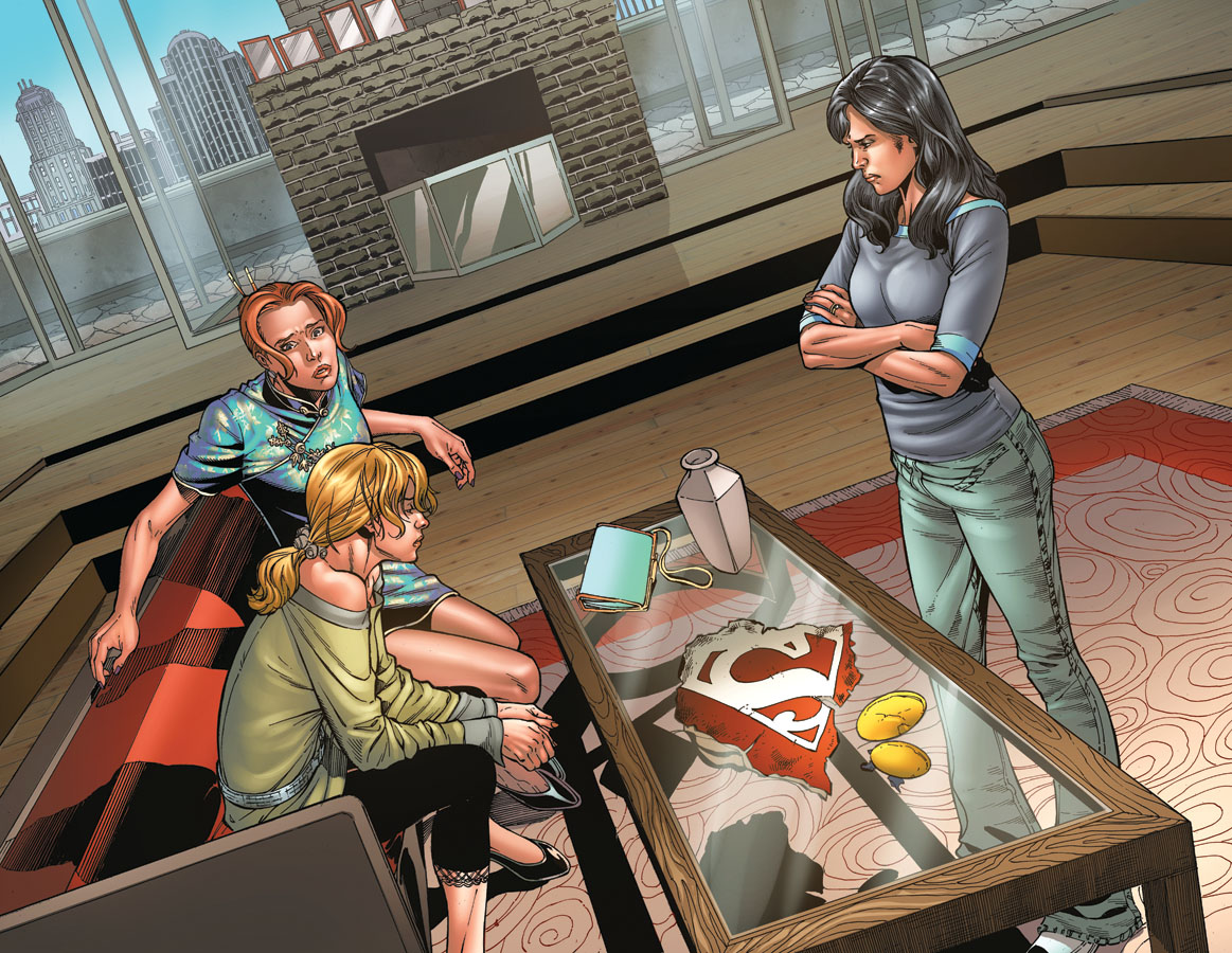 Another fun sequence for me was the interaction between Lana, Lois and Kara. These ladies were really the cast of our series at that point. I did everything I could to differentiate them stylistically, not just facially. I had Lana dressed almost exclusively in Asian influenced clothing, something I saw Carlos Pacheco do with her a bit in Superman. Mandarin jackets, Chinese dresses. Kara ,at least in this instance, was dressed in an outfit I found in a Japanese Young Miss magazine, but I felt was an almost "Civilian" version of her Supergirl costume. Lois was much more conservative.
