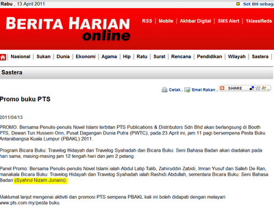 PROMO: Bersama Penulis-penulis Novel Islami terbitan PTS Publications & Distributors Sdn Bhd akan berlangsung di Booth PTS, Dewan Tun Hussein Onn, Pusat Dagangan Dunia Putra (PWTC), pada 23 April ini, jam 11 pagi bersempena Pesta Buku Antarabangsa Kuala Lumpur (PBAKL) 2011.