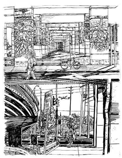 This panel background, the one with the trees painted upside down on the overpass structure, is from photo reference I took of public art on the Gardiner Expressway in about 2008 or so. Rodney Graham‘s Tree Portraits wrapped around the pillars beneath the Gardiner Expressway, creating an inverted forest within a concrete jungle. [1][2][3]. The last location in this scene is set in a nearby space inspired from some other public art too. Found near the Toronto Music Garden, in the Spadina Quay Wetlands. I changed it to suit the story with PJ, from what looks like a small factory building to a house.
