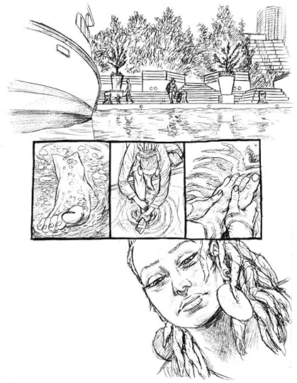 This spread comes from a scene in the later half I really like. It’s a work of contemporary fiction, with healthy doses of magic realism, & influenced by cinematic neorealism. There’s a Pulp Fiction inspired subplot, and several interwoven storylines. I hope it to be an engrossing and lush reading experience.