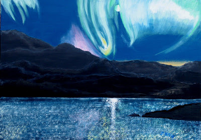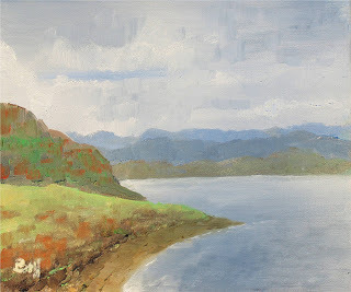 This is a recently dashed off painting depicting the view over Loch Ewe from Kirkhill House's front porch - aka my studio. It's the smallest picture I've painted in oils to date - canvas about 20 x 16 cm.