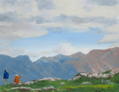 One of the figures (no, they're not Dee and me) is pointing to a skein of geese, probably the pink-footed species common to these parts but perhaps on their way to their breeding grounds in Iceland.