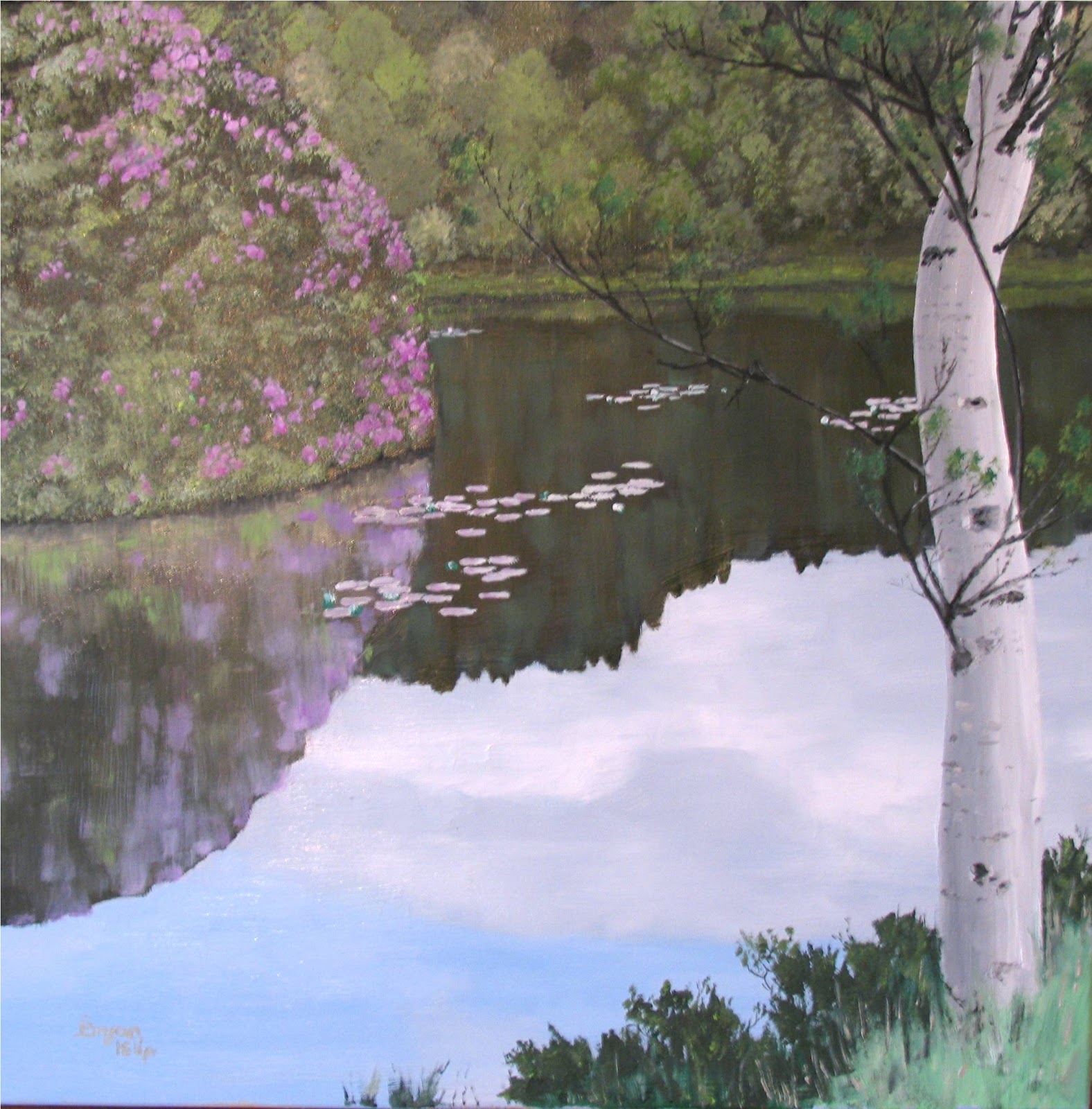 Here's my latest painting - (still wet) oil on canvas size 700 x 700 cms. It's another version of the little lochan called (in English) 'The lochan of the thin cow" which lies just by the roadside to the north of Poolewe. I'm planning to offer it to a local gallery for sale at. Title: Lochan with rhodedendrons, waterlilies and silver birch.