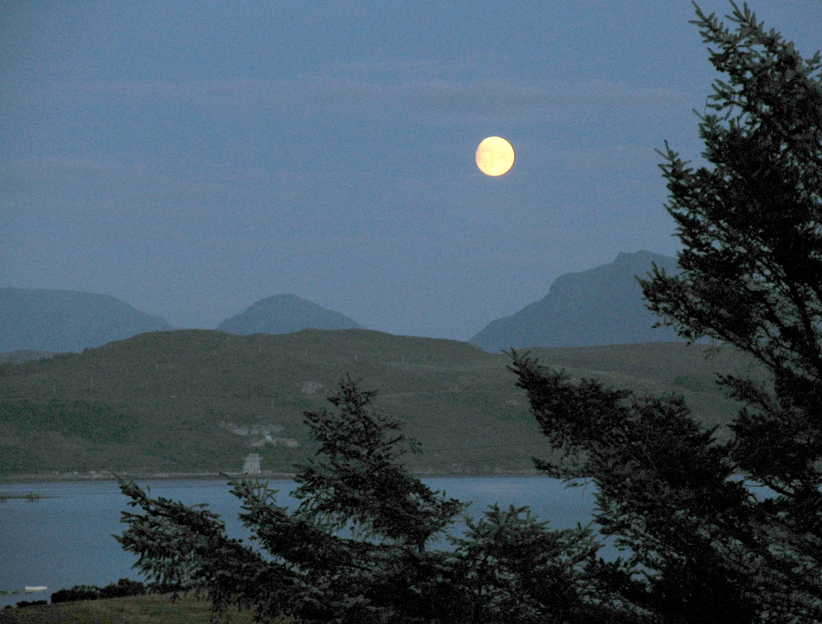 I took the photo from outside our home in Aultbea, therefore the water is Loch Ewe and the mountain (or 'hill' as, locally, we call all Scottish mountains) is Beinn Airidh Charr. I often think when looking at this one of our friend M's account of her ascent of it, years ago, probably before Mr Armstrong set first foot on that golden orb up there. She was and we were so much younger and fitter than now. Sigh! But hey, looking back is a mistake and besides, I get as much pleasure from just seeing the hill that was there long before Mankind first set foot on planet earth than were I able to climb it this very day. I wonder if I could? ... well, I know I could try ...
