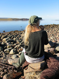 Dee on one of her usual rocky perches. Here is where we sit eating our sandwiches etc, close by the crumbling remains of a wartime gun emplacement. The land across the water is