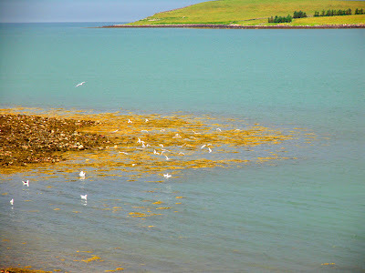 Then today we looked out of our window to the low tide scene in my photo. Nothing unusual in that, you may think. But oh yes there is. That cloud of diving terns, black headed gulls and common gulls are not there by accident. For some days there has been this evidence of new life - millions, probably billions of herring or mackerel fry being driven into the shallow edges outside Kirkhill House by the large, predatory fish below. Once there in the shallows the birds can also get at them.