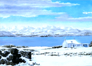 That very first February I took out my pastels and 'painted' this winter snowscene. I called it Across Isle Ewe, for it is the view from Peace Cottage. The croft house in the middle distance is now the very successful Aultbea Smokehouse. But before that I had created a series of twelve Highlands Wildlife pictures using a method involving literally hundreds, even thousands of digitally coloured Word Draw shapes. The following Springtime, for the first time I 'exhibited' at a crafts market my artworks as greetings cards . That was in Ullapool. I managed to take eight pounds and fifty pence. Not long afterwards I did a sales tour of the local shops. With what pride did I get home and drop more than four hundred pounds in paper of the realm on the dining room table in front of an astonished, not to say delighted Delia. Our income tap was once again turned on, albeit in but a trickle, but I had big ideas - of course I did - and what a place in which to have them!