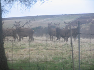 Crouch down so they won't see you through the window. They are these twelve red deer in the unkempt field beyond our back garden. I took a photo but a combination of weak light and window glass obscured by the winter weather ... still, you get the picture.