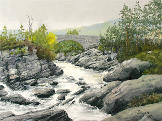 Current activities include a new pastel painting - the Blackwater river at Little Garve. This is a real Highland torrent rushing whitely through its split stone, densely wooded gorge. About half done.