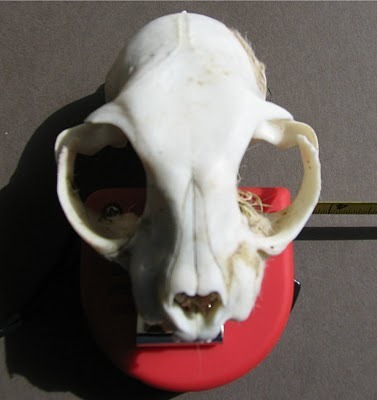 For those who try to avoid the somewhat macabre, please look away. We found this little skull on our mid-day walk the other day. It was in a scattering of bones down by the sea shore. A bedraggled clump of fur (rabbit?) appeared to be wedged between the creatures's teeth. I've been trying to identify it. It measures 10cm x 7cm across and has the teeth of a carnivore. Otter? Cat? Pine marten? These are the only possibilities, I think. Any ideas?