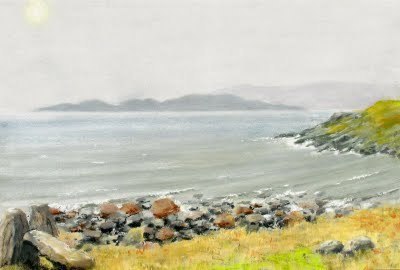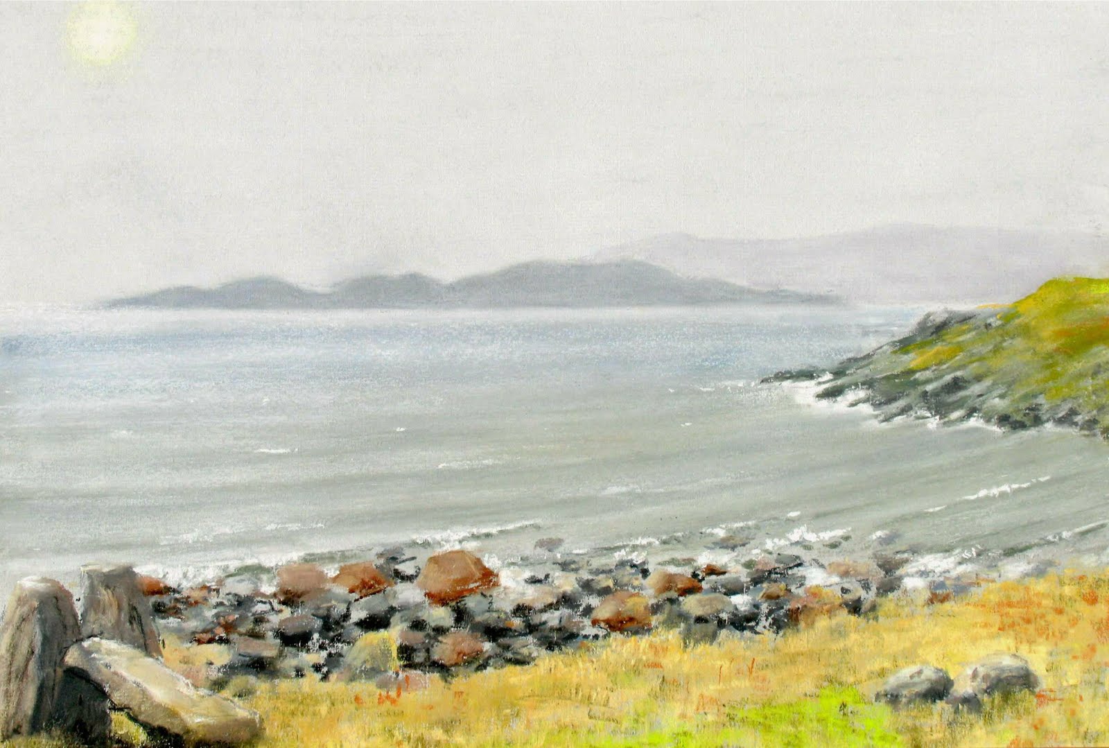 This pastel hangs in our living room. I 'painted' it in the early '90's. It remains as fresh and unchanged as the day in was born in Mrs Mackenzie's South Erradale holiday cottage. It's my only attempt, to date, at a depiction of the kind of quiet light rain / sun-struggling mist that's so common in the early Autum up here. I was looking over Gairloch towards Longa Island and the north shore. Behind the island are the dunes of Big Sand camping ground where in 1974 we put up our tent, having f...