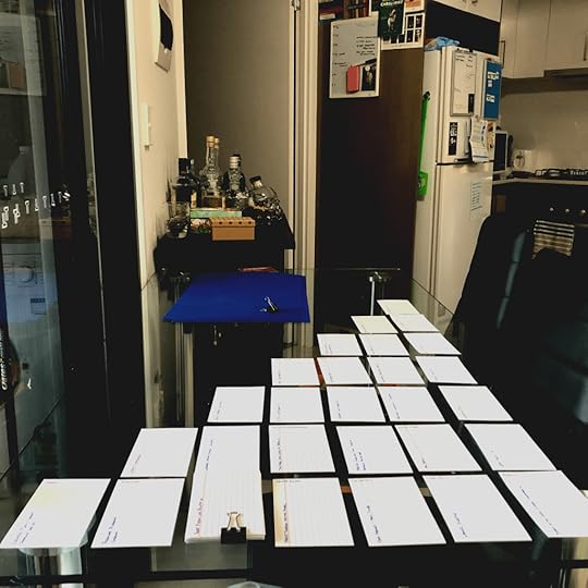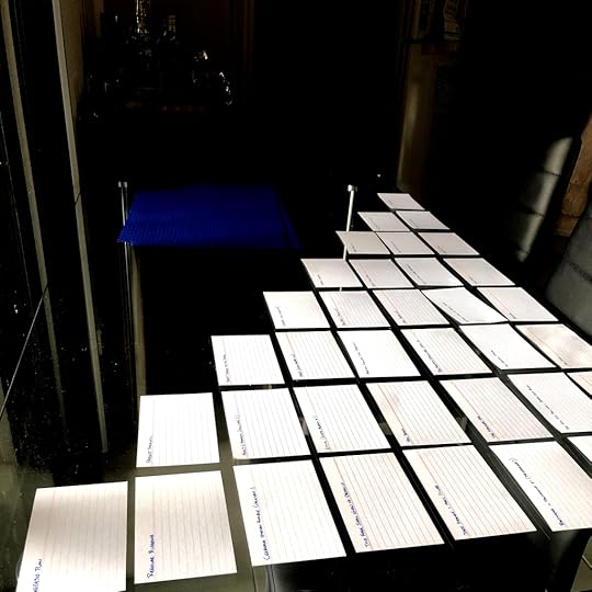 Grab a bunch of index cardsEvery writing and publishing project that has my attention gets a card, regardless of what stage it’s at, or where the results will be published. All that matters is that it’s on my mind mind, and getting a fraction of my attention or work time–and both publishing tasks (like creating Short Fiction Lab bundle) and writing tasks (like drafting a story, a novel, or a series bible) are taking up mental space.Scribble in deadlines for any projects that have them.Sit down at the table and start arranging the projects in a pyramid–the most important goes at the top, the least important at the bottom. Each row can only be one card larger than the row before it. The results will end up looking something like this.