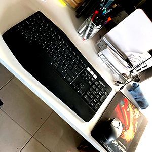 The keyboard was a change requested by my partner, especially since the new desk set-up makes it easier for me to work over weekends. See, I have a habit of typing incredibly fucking fast when I’m in first draft mode, and I’ve always worked on old, cheap banger keyboards that make an incredible racket when I’m really flying.