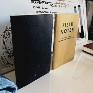 In practical terms, they’re roughly the equivalent of the slim pocket Moleskinses–same size, same page count, same cardstock cover. I may even lean towards the Moleskine’s paper a little harder, since it’s a nice comforting cream rather than the stark white of the baseline Field Note. Here’s a shot of two in-progress notebooks from both brands, if you’re interested in a comparison:
