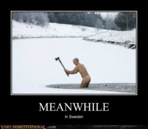 Yet somewhere between thoughts, between “I think my breasts have frozen off” and “A polar bear is chasing me, I must swim for my life”, I found a sweet spot of about 30 minutes. And in that 30 minutes, there is a quiet place, there is zen, there is the comfort and vaguely masochistic pleasure of the burn in my muscles because it’s the only warmth anywhere in that goddamned swimming pool. But there is also definitely “better”. I’m on day three of this: I feel better, my mind is clearer, my aches and pains are not gone but are falling away. I swim until there is no longer that burn in my muscles; I swim until the creature I like to call “Hypothermia the Hallucinatory Polar Bear” turns up at my shoulder and says “Hey, kid? It’s time. No, really. It’s time, you’re not meant to be this shade of blue.”