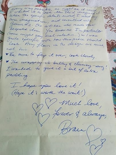 Sure, it’s a month late, but Best Brains care not for such trivialities of time and space, for we are Immortal (or have detailed plans in train to be so). Also, because when your best friend says “I’m having something made for you!” you just fecking wait patiently. When said present arrived in a bulky parcel, I texted “It’s here” and we face-timed while I opened it. Everybody does that, right?
