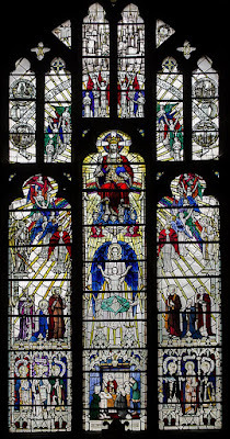 That same website offers a snarky comment about Elgar's memorial stained glass window being in the Anglican Worcester Cathedral (image use under the Creative Commons Attribution 2.0 Generic license: "The Elgar Window by A. K. Nicholson, 1935, based on the Dream of Gerontius. The window shows Gerontius ascending to the Heavenly City, surrounded by figures from the Bible [?]*."