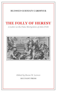 The Folly of Heresy was first published in 1534. It was written in response to the trial and supposed martyrdom of John Frith, who famously denied the Real Presence of Christ in the Eucharist. The author, Blessed Germain Gardiner—himself martyred in 1544 for denying King Henry's religious supremacy—saw in Frith's case a dangerous occasion for confusion and scandal among England's Catholics. How could they, he asked, honor a man who denied so important a doctrine of the faith? The work (which first bore a verbose title beginning with A letter of a yonge gentylman...) is not only a Scriptural-Patristic defense of the Real Presence but also a brief chronicle of Blessed Germain's personal interviews of Frith before the latter's sentencing. His account, beyond being valuable to Christians interested in Sacramental and Eucharistic theology, is in fact of extraordinary value to scholars of Henrician religious history. Despite its value, it has remained out of print since it was first issued almost five hundred years ago.