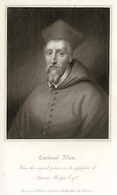 He was the third son of John Allen of Rossall, Lancashire, and at the age of fifteen went to Oriel College, Oxford, where he graduated B.A. in 1550, and was elected Fellow of his College. In 1554 he proceeded M.A., and two years later was chosen Principal of St. Mary's Hall. For a short time he also held a canonry at York, for he had already determined to embrace the ecclesiastical state. On the accession of Elizabeth, and the re-establishment of Protestantism, Allen was one of those who remained most stanch on the Catholic side, and it is chiefly due to his labours that the Catholic religion was not entirely stamped out in England. Having resigned all his preferments, he left the country in 1561, and sought a refuge in the university town of Louvain. The following year, however, we find him back in England, devoting himself, though not yet in priest's orders, to evangelizing his native county. His success was such that it attracted notice and he had to flee for safety. For a while he made himself a missionary centre near Oxford, where he had many acquaintances, and later for a time he sought protection with the family of the Duke of Norfolk. In 1565 he was again forced to leave England, this time, as it turned out, for good. He was ordained priest at Mechlin shortly afterwards. The three years Allen spent as a missioner in England had a determining effect on his whole after life. For he found everywhere that the people were not Protestant by choice, but by force of circumstances; and the majority were only too ready, in response to his preaching and ministrations, to return to Catholicity. He was always convinced that the Protestant wave over the country, due to the action of Elizabeth, could only be temporary, and that the whole future depended on there being a supply of trained clergy and controversialists ready to come into the country whenever Catholicity should be restored.And authors like Philip Hughes and Eamon Duffy praised the kind of formation Allen designed for the missionary priests--they weren't going to be in parishes and they were probably going to be alone most of the time--they needed to be trained for apologetics with knowledge of Church history including English Church history, the Bible, and Church doctrine. They needed to preach in English, obviously, and he also prepared them carefully for their spiritual life in the missionary field: fasting twice a week for the conversion of England, use of St. Ignatius's Spiritual Exercises, frequent Confession as spiritual development, not merely juridical forgiveness of sins, and other spiritual devotions.