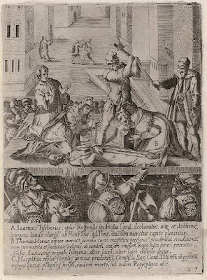 Image Source (Public Domain): Drawing of one the frescoes by Niccolò Circignani in the Venerable English College in Rome, depicting the executions of Saint John Fisher, Saint Thomas More, and Blessed Margaret Pole (which did not take place at the same time!) A=Fisher beheaded; B=More being beheaded; C=Pole, next to be beheaded.