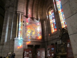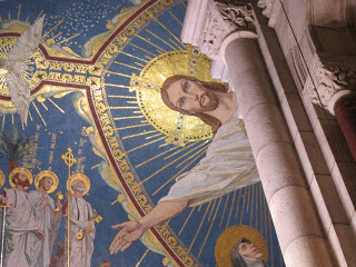 Whenever Mark and I visited Sacre-Coeur, we noted the contrast between the square outside the basilica, with souvenir hawkers and tourists just looking out over the vista of Paris beneath, to the quiet and hush of the church inside, with ushers urging men to take off their baseball caps, and muffled sounds of footsteps around the church.