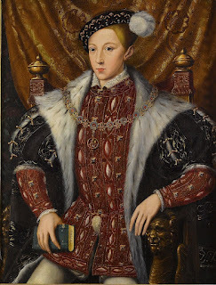 Image source (Public Domain): Portrait of Edward VI of England, seated, wearing a gown lined in fur (ermine or lynx) over a crimson doublet with the collar of the Order of the Garter and holding a Bible.