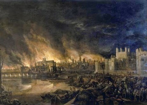 The Great Fire of London began on September 2 in Pudding Lane 348 years ago today (1666) and would burn until September 5, destroying 13,200 houses, 87 parish churches, and many government buildings. King Charles II and his brother James, the Duke of York worked hard to direct fire-fighting efforts, but the fire's penultimate day, Tuesday, September 4th was the day of greatest destruction, as St. Paul's Cathedral caught fire and was ruined that day. This was the great medieval, Gothic cathedral built between 1089 and 1314, containing wondrous stained glass and with a tall spire. It had of course fallen into disrepair, having been damaged by Puritan forces during the Civil War.