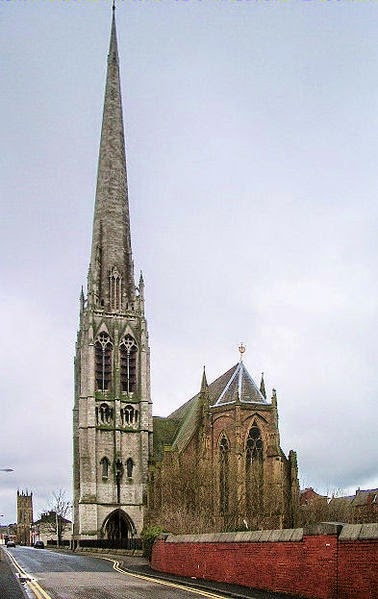 St. Walburge's, named in honor of St. Walpurga, an 8th century Saxon princess, abbess, and saint, was built in the mid-19th century during the Catholic revival in England after Emancipation. Begun in 1850--the year of the restoration of the Catholic hierarchy by Pope Pius IX--it was designed by Joseph Hansom and dedicated in 1854. Its spire is the third tallest in England and is the tallest parish church spire (as opposed to a cathedral, like Salisbury and Norwich, the first and second tallest!).