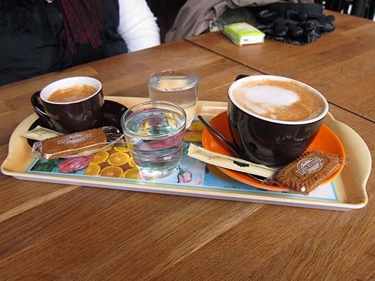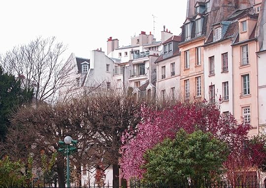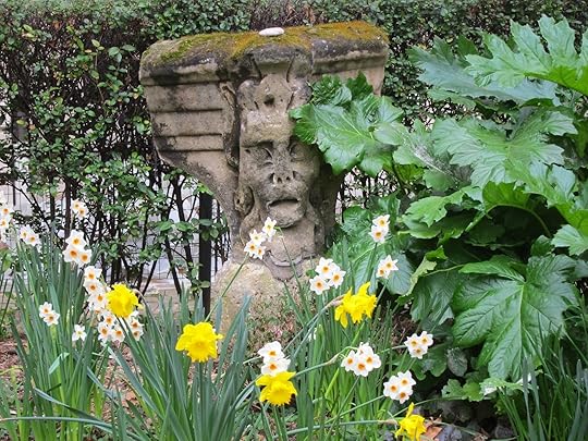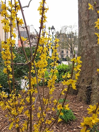 On our way to the Musee de la Carnavelet (which was closed "extraordinaire" when we got there) we stopped at Le Sevigne near Parc Royal and Square George Cain for espresso and cafe au lait, served with d'eau in those little glasses. Even before we arrived at this charming cafe we saw the signs of Spring--particularly the herald of spring: forsithia.
