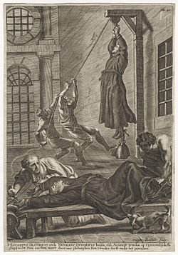 Walpole was tortured brutally on the rack and was suspended by his wrists for hours, but Topcliffe stretched the tortures out over the course of a year to prevent an accidental death. Walpole endured torture 14 different times before being returned in 1595 to York to stand trial under the law that made it high treason for an Englishman simply to return home after receiving Holy Orders abroad. The man who had once aspired to be a lawyer defended himself ably, pointing out that the law only applied to priests who had not given themselves up to officials within three days of arrival. He himself had been arrested less than a day after landing in England, so he had not violated that law. The judges responded by demanding that he take the Oath of Supremacy, acknowledging the queen's complete authority in religion. He refused to do so and was convicted of high treason.