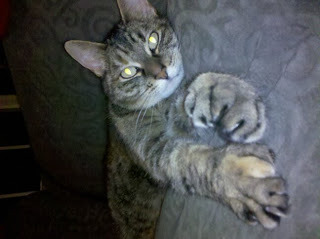 I think I've mentioned Bianca's cat, but I was calling her Luna. Due to character growth, I've decided to name her something else. I asked my own beautiful sister if I could name Bianca's cat after her cat, 'Toe-Jam.' See the paws? That's why. The real Toe-Jam is a very good cat who has lived a good, long life taking care of my sister. The fictional Toe-Jam starts out as a kitten, but is gray and stripey too.