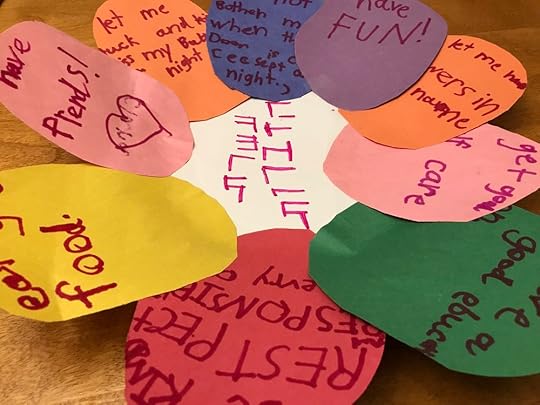 Have fun!Let me tuck and kiss my brother at night.Eat good food.Have friends!Have a good education.Get good helf care. (healthcare)Do not bother me when the door is close (except at night).Be kind, respectful, and responsible every day. Let me have flowers in my room.