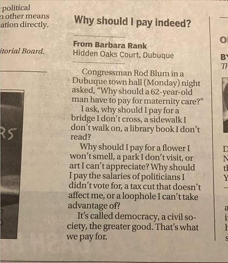 Newspapers still exist, and thank goodness they do, not only for their important investigative journalism, but to also give voice to ninja-level truth tellers like Barbara Rank from Hidden Oaks Court in Dubuque. Iowa.