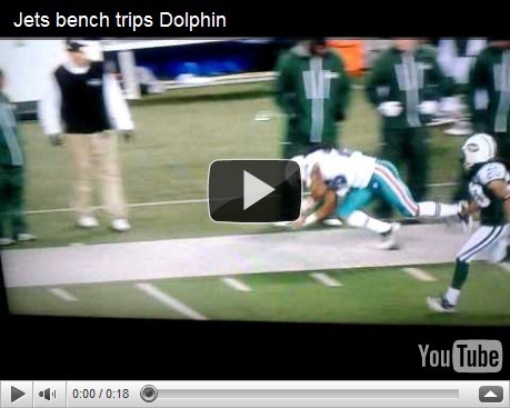 This unidentified New York Jets staffer tripped Miami Dolphins player Nolan Carroll as he was running out of bounds during a kickoff in today's game.
