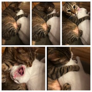 Pluto, the darker cat, is cuddling with Tobi, the white cat. Holding onto him with his paw, licking his fur, and kneading his skin. Then Pluto stopped, looked up at me as if to say, “Watch this,” and then attacked.