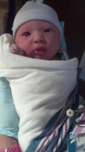 I’ve been waiting for a very special person to arrive. She finally did on Thursday, July 5, 2012 at 5:26. Under that hat is fine strawberry blonde hair. She has blue eyes.