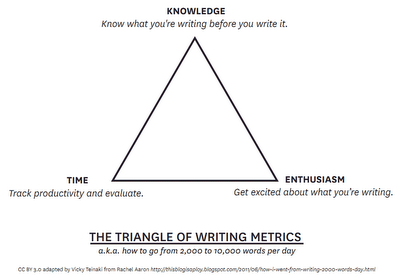 I had a friend stay with me in Galway who needed to get some writing done for a deadline. She regularly wrote about 10K/day on average the entire weekend. It can be done. It does require, as Aaron suggests, that you know where you’re going (i.e. outline) but how you work with that knowledge will vary. I’m going to concentrate today on the side of the triangle Aaron calls, “Enthusiasm.”