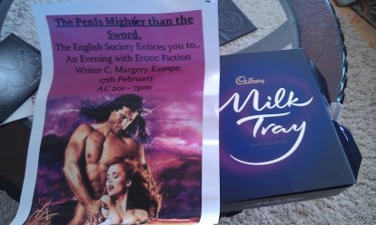 A colleague invited me to speak on campus at NUIG for Shag Week. Or rather she suggested to the English Society, a student organisation, that they invite me — and they did! I thought this was rather nice. Of course they had to use the Fabio cover for the poster — rather lurid, but apparently effective as we had a pretty good crowd on a Friday night, in fact a crowd that included men as well as women.