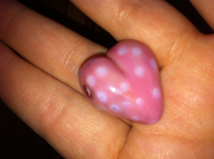 Pink Polka Dotted Heart that will be put on a black silk cord necklace for our winner!