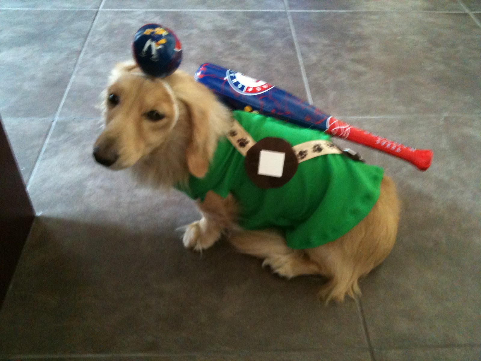 Our little grand-doggie is entering Bark in the park in Texas - he has to go dressed with a baseball theme. He's not impressed!