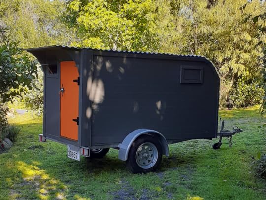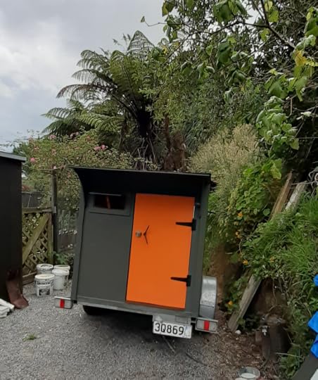 Nearly everything is recycled. I mixed paint from a whole lot of free stuff I got at the Tip-Shop. The inside walls are lined with hessian fabric I paid $8 at an op-shop several years back and have used on many projects so far. The roof supports I cut from a leftover piece of 2x2 from a previous project and doubled up ply cut to size. All the trim timber and corner pieces were scavenged from roadside throw-outs from joinery businesses and an old collapsed lattice screen from the garden. The corro roof was second hand from my dismantled sheds. The wool carpet for under the mattress was given to us. It will also provide floor insulation. The door I made from more rescued timber, the hinges were reused from an old gate set. I de-rusted and tarted them up with black zinc paint. For the door handles I repurposed old TV screen legs.