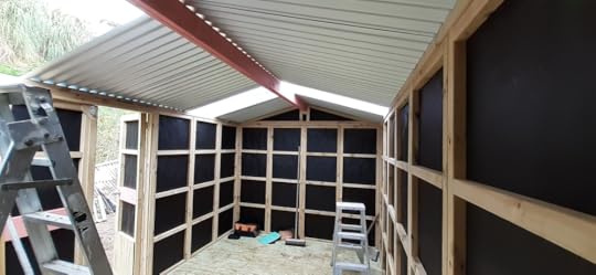 The wall-panels were 600mm wide and easy to manage on my own. The main roof beam was massive but I figured a way of getting it up and secured. The only thing I couldn't manage by myself was moving and setting the double-doors. The missus came to the rescue.