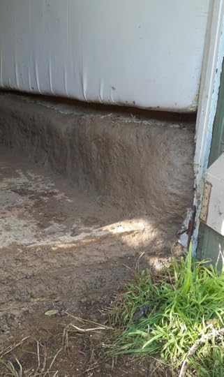 I left all the windows and door open to dry the cob plaster and air things through. The cob on the earthbag half-wall has dried a lot and there’s some cracking which is normal. I probably should have added a bit of sharp-sand to the mix to give it strength and also straw for its tensile qualities … but I didn’t have either and was keen to just have a go. The mud method is pretty forgiving, especially as I just wanted an earth plaster to cover the polyprop bags and keep them protected from sunlight.
