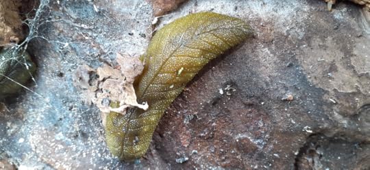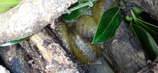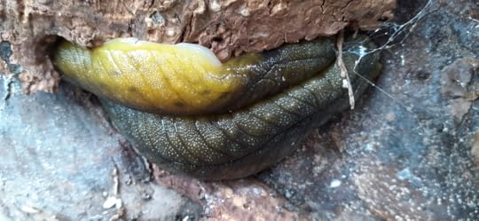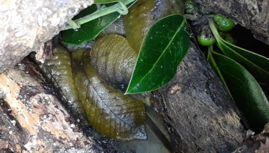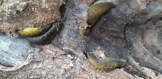 I noticed something when I looked closely at the bare wood and folds of bark callous. Shapes, green and humped, some with little nodules. Native leaf-veined slugs.