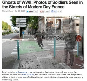 Here’s an article about the Ghosts of War project operated by Dutch historian Jo Teeuwisse in which he blends photos taken during the Second World War with photos taken on the same spot today.